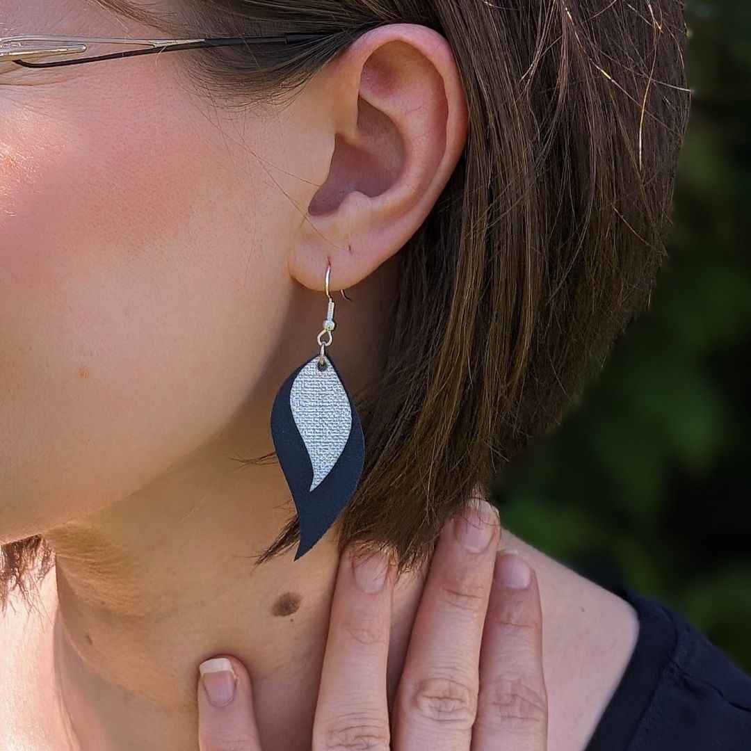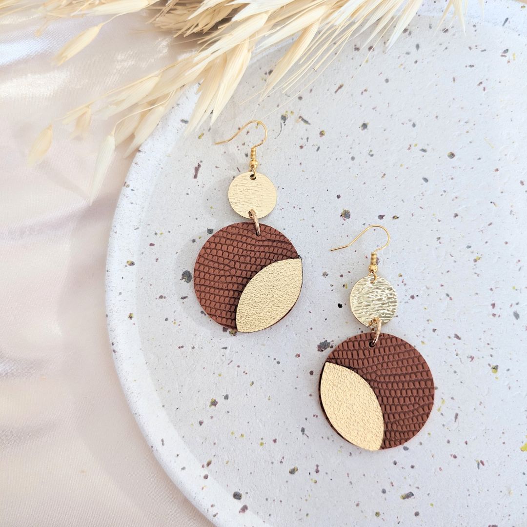 - Simili cuir texturé écailles. L’arrière des boucles d’oreilles est d’aspect suédine.