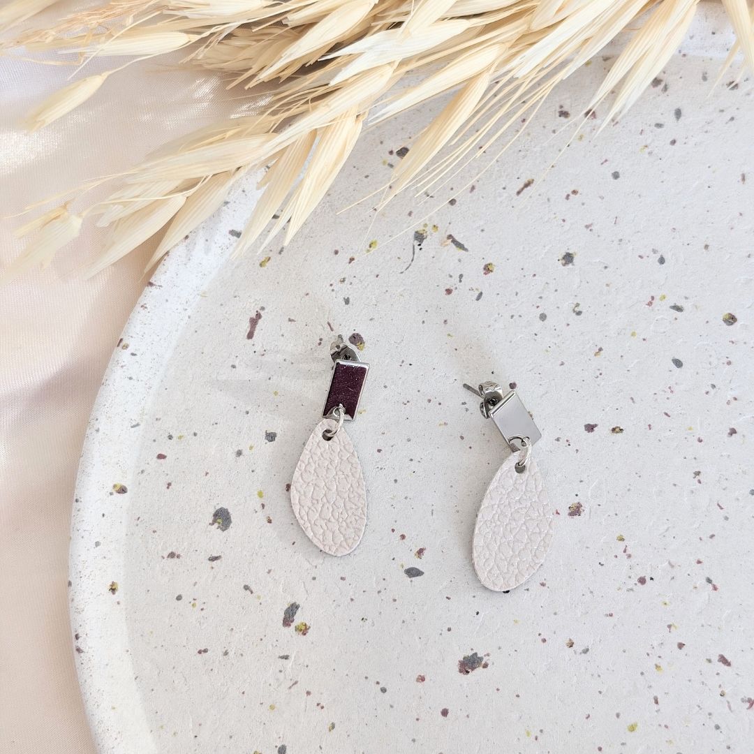 - Simili cuir texturé blanc irisé. L’arrière des boucles d’oreilles est en simili cuir gris irisé.