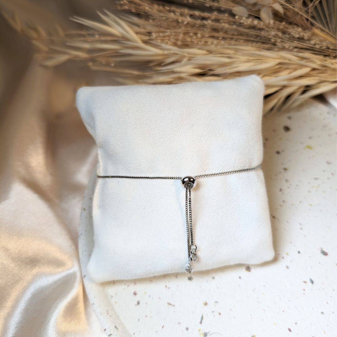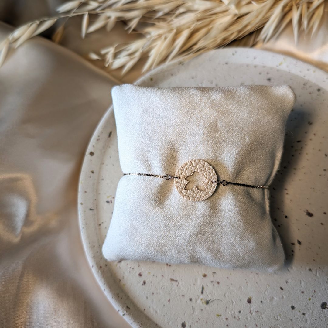 - Bracelet en laiton argenté, réglable avec un anneau de serrage.