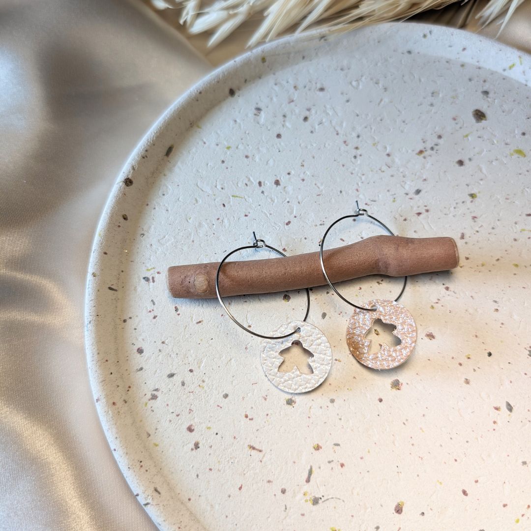 - Pastille en simili cuir double face, blanc irisé et rose irisé. Meeple découpé à l’intérieur.